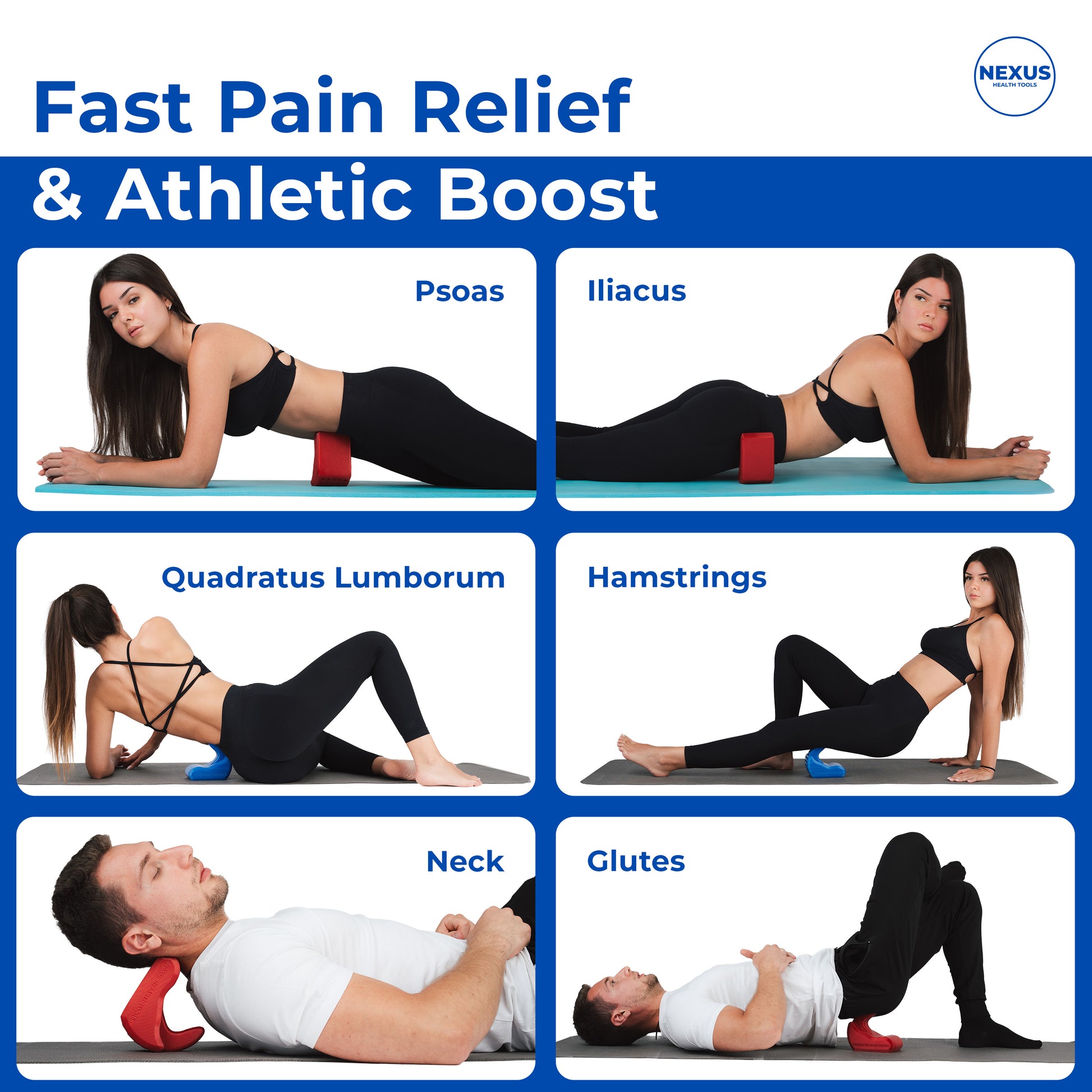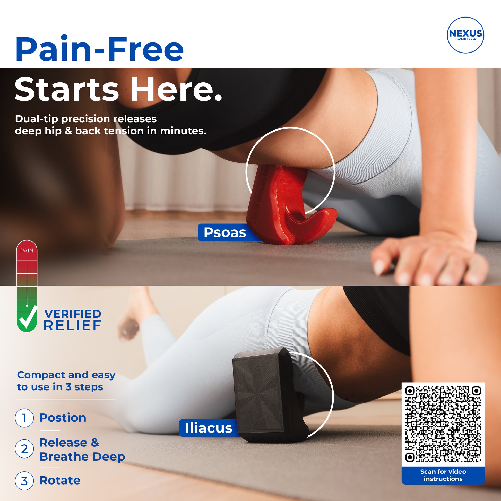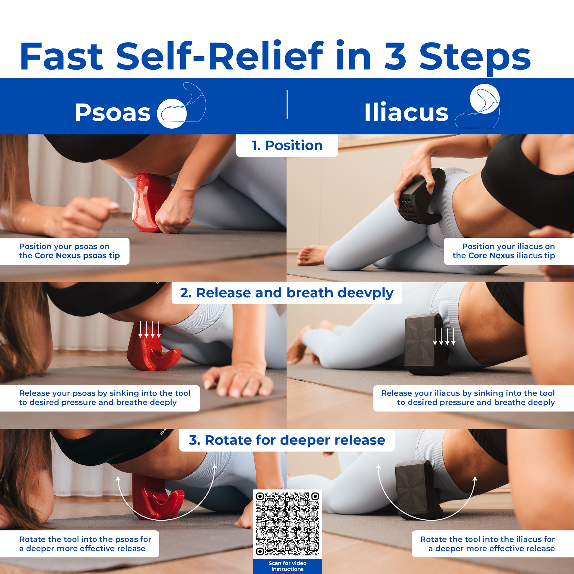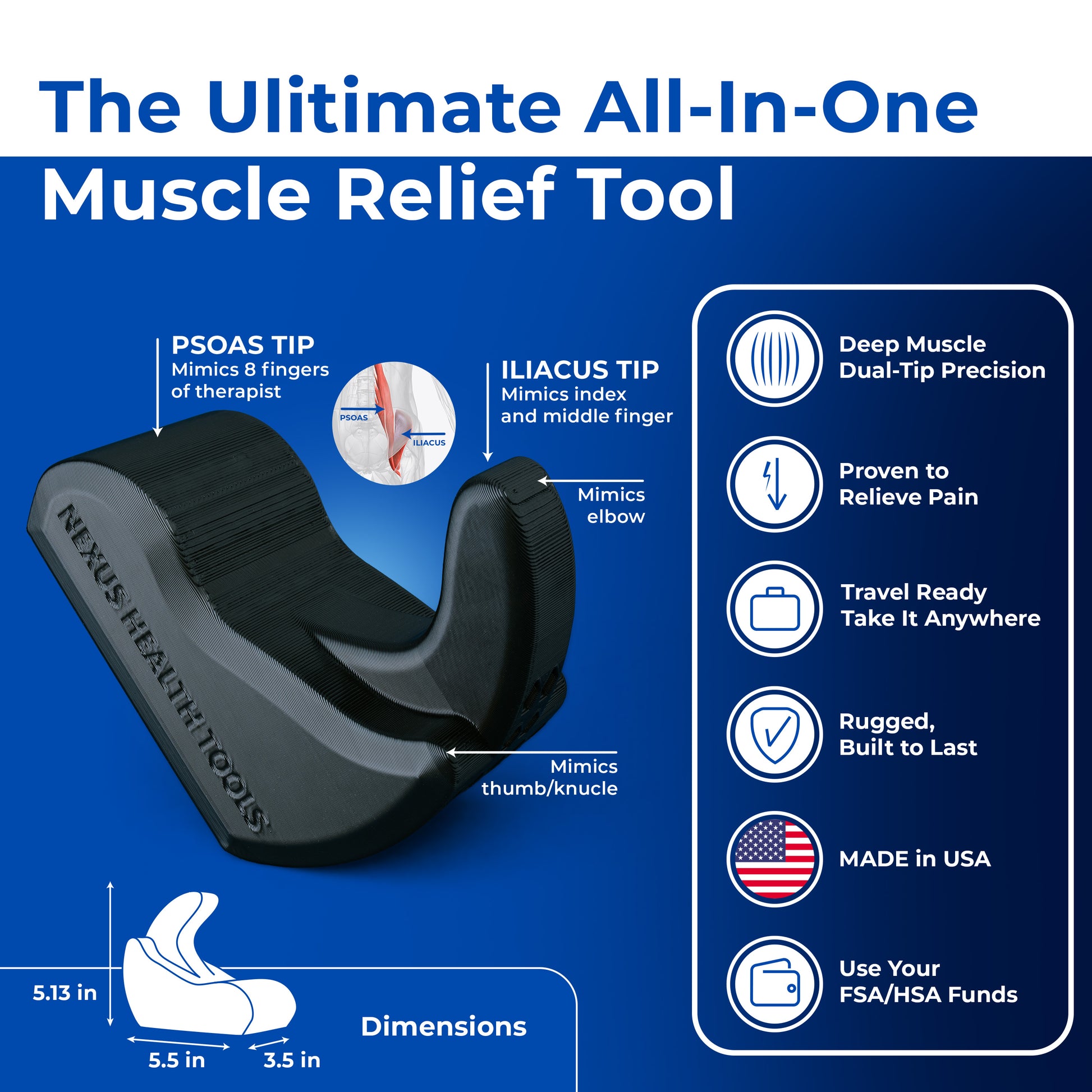 - QUICK & EASY RELEASE 🚀. The root cause of lower back, hip, and sciatica pain often lies in tight psoas and iliacus muscles. The Core Nexus is the only tool with uniquely designed tips for each muscle, ensuring precise targeting and effective release 🎯. Its rotating design enhances muscle release and saves time by precisely rotating into these muscles ⏱.